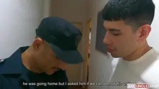After a long shift patrolling the neighboring streets, Security Guard Alan is ready to go home. On his way to the bus stop, he is approached by a neighbor holding a camera who asks him about his uniform and the possibility of renting it for a photoshoot. Rather than lending his uniform, Alan volunteers himself for the photo session, following his new friend to his house. There, he meets Alex B, a young Latino eager to make it as a horny model. Attracted by Alan’s uniform, Alex feels the urge to service the officer, dropping to his knees to suck his cock. The taste of the security guard’s shaft in his mouth makes Alan go wild. The camera keeps rolling as Alex shows Alan how thankful he is for his service. Aroused by the sensation of power he has over Alex, the officer gives the boy a true taste of dominance by pounding his hole like no other man had done before.