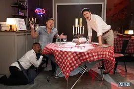 Logan aarons interessiert sich viel mehr für den heißen kellner adrian hart als für sein date oder den berühmten stroganoff des restaurants. Er und adrian flirten, während sein date das menü studiert, und er saugt den kellner heimlich. Adrian geht unter den tisch, um logans schwanz zu schlucken. Bis zum Datum Benachrichtigungen! Jetzt ist logan frei, sich offen mit dem hottie zu verbinden und auf adrians schwanz zu sitzen, bevor die spitze ihn doggystyle über den tisch fickt. Adrian räumt das Geschirr und die Kerzen weg, damit er Logan im Missionar ficken kann, und spritzt dann in den Mund des Bodens, während Logan sich streichelt, bis er seine Last schießt.