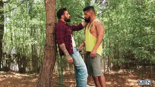 Scott Carter espia a Justin Jett trabajando en el parque y viene a la cerca para una mirada más cercana, dejando que el hundimiento barbudo atrape un vistazo de él antes de que se desplome en los árboles. Es el turno de Justin de seguir y ver a Scott mientras se toca y los chicos se miran. Ellos sacan sus pollas y ranas, y Justin chupa a Scott y lame su axila antes de que Scott dedos en la parte inferior y enjuaga su agujero. La parte superior se folla al estilo de Justin, luego lo monta en el suelo antes de que ambos tíos se golpeen hasta que se cum.