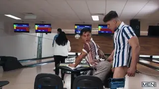 Bowling Alley Fuckdown: Angel Santana asks his pal's hot BF Malik Delgaty for some pointers on his bowling form, and gets turned on when the hunk's junk grinds against his booty as Malik comes behind to show him how it's done. But Angel gets the wrong kind of split when he bends over and rips his pants! Malik notices the easy-access hole and sneakily fucks Angel, then the bottom sucks him. Malik bends Angel over before the dark-haired twink rides that big cock. Malik drills the bottom at the scoring table till Angel orgasms, then pulls out and shoots cum to spare.