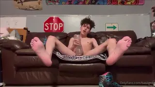 Basil Gray si masturba sul divano, scopando un fleshjack.