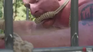 The Adventure of Brody Fox: Part Six, Black Mountain: Woodsman Heath Halo comes upon a naked stranger, Brody Fox, on his knees in the dirt, with his head buried in the ground. Heath unties Brody and gently carries him to his primitive hunting cabin in the woods. Days pass while Heath nurses Brody back to health. Brody learns that Heath used to share this cabin for kinky bdsm getaways with another man. That man stopped coming to the cabin so Brody, to repay Heath's kindness, offers to become Heath's new slave. Heath doesn't hesitate to accept Brody's offer. Brody's naked body is bound and suspended in rope, inside a metal cage. Brody's mouth is gagged and his pale ass is wedged up against the back of the cage for easy access. Heath, dressed in a leather harness, leather gloves and leather boots, approaches the cage with zapper in hand. Heath teases and torments Brody's pink puckered asshole before sliding his hard cock inside. Brody can't move an inch, while Heath pounds Brody's pink ass with his hard cock. Heath removes Brody from the metal cage so he can get at Brody's cock. Heath enjoys stroking and sucking Brody's cock, but pulls away before Brody can come. Instead Brody is on his knees getting face-fucked by Heath. Heath loves to feel Brody's lips and tongue wrap around his throbbing man-meat. Brody sucks on it like it's his first meal in weeks. Heath is so worked up he gives Brody's ass a hard flogging. Next Heath uses a bamboo cane to abuse Brody's already sore ass. Next is the command to lick Heath's leather boots. Heath's cock is ready to explode now so he flips Brody around and bends him over for some deep-dick ass fucking. Finally Heath explodes all over Brody's gaping mouth and face. Pleased with his new slave, Heath is generous enough to allow Brody to cum on his leather boot.