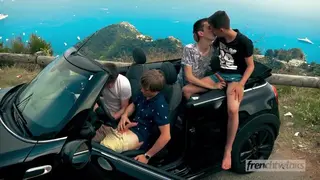 Orgy on the French Riviera: Justin Leroy and his boyfriend Lucas Bouvier do a short trip on the French Riviera and as they drive along the sea, they see Mael and Ethan who take in the breathtaking view of the Mediterranean. Justin and Lucas decide to go greet these two pretty twinks and invite them to take a ride in their cabriolet. The four boys will indulge in a little exhibition game in an idyllic location and suck each other in the car. The afternoon will continue in the bedroom of Justin and Lucas where couples will mix and fuck with passion before cumming in turns on Mael covering his body and face with hot cum. "Hot Twinks Fourway" Justin and Lucas go on a little trip around the French Riviera and while they drive, hair in the wind at the seaside, they see Ethan and Mael below looking at the breathtaking view of the bay. Justin stops by the side of the road and the couple decides to get a closer look at these two pretty twinks. Mael and Ethan who enjoyed a romantic moment out of sight are joined by Justin and Lucas who come to say hello and invite them to follow them for a ride in a cabriolet. The four boys park at the edge of a cliff and begin to suck in the car. The two couples are watching each other and getting closer. The little voyeur exhib game lead them to continue the afternoon in the bed of Justin and Lucas. Justin, Lucas, Mael and Ethan suck each other and eat their ass in turn. Lucas starts then to fuck his boyfriend while Mael takes care of Ethan's tight ass. The atmosphere is boiling in the room and couples are mixing. It's now Justin who's fucking Mael while Lucas pounds Ethan who's screaming loudly. Mael, unused to being a bottom gets banged by Justin clenching his teeth and takes the cock shots with a growing pleasure as his little hole expands. Once Lucas has finished with Ethan he just comes behind Justin and penetrate him. The beautiful blond is now taken in sandwich between Mael and his boyfriend. Ethan, Justin and Lucas will end cumming in turn on the body and the face of Mael who will explode a few seconds later in a massive ejaculation.