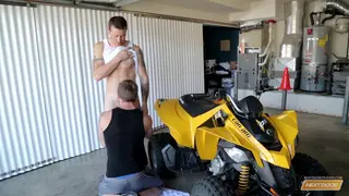 Mark Long é bastante aparente. Entre seu corpo duro de rocha, seu quad chamativo e seu pau gigante, ele não está sofrendo por pretendentes. Apenas observando-o por alguns minutos, Sean Blue pode dizer que Mark tem algo que vale a pena consertar sob seu capô. Assim como Sean observa Mark tomar um rápido 5 de consertar seu quatro-runner para acariciar sua outra vara quente, Sean aproveita o momento e faz seu avanço. Mark só deixou as mulheres montar seu monstro até agora, mas Sean convence-o a ir outro caminho, e assim que Sean envolve seus lábios em torno de seu pau esperando, Mark percebe que ele está perdendo. Sean chupa seu eixo, sufocando-se com o comprimento total do pau de Mark, e uma vez que ele não pode aguentar mais, ele dobra Sean sobre o assento de seu quadriciclo e dá-lhe o negócio, levando-o por trás como Sean agarra o guidão para a estabilidade. Sean e Mark violam os avisos claramente postados para andar em dupla no quad, jogando cautela ao vento enquanto Mark vira Sean e continua a bater caminho, fodendo o cum fora de Sean antes de puxar para fora e descarregar todo o seu peito. Pelo menos o Mark sabe que os choques estão a funcionar bem.
