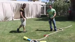 Depois de jogarem um rebocador de guerra, vão para o quarto. Em pouco tempo, eles são 69 um ao outro. Aiden engasga-se com o pau grosso e sem cortes de Caim – e isso está excitando Caim, grande momento!