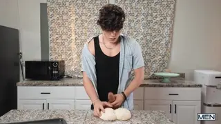 Joey Mills amasa galletas desnudo solo con delantal, con su caliente culo a la vista su novio Drake Von lo folla parado, llegan invitados y joey lo deja muy caliente con la polla dura y Drake se corre en la masa, ya cocidos los bocadillos comparte entre amigos y joey come uno y esta relleno de esperma espantados se van los invitados y ya bien cachando Joey y Drake vuelven a follar bien duro Drake lo somete bien a fondo y joey goza como buena zorra y terminan corriendose así da gusto