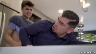Jason Wolf was talking with his mom in the kitchen when stepdad Jeremy Spreadums came over and hugged mom. While he was hugging her he groped Jason’s balls. Next day mom was on the phone, Jason was cleaning away the dishes. Stepdad took his dick out and jumped Jason, pulling down his pants. Jason was quick though, he turned the tables on his stepdad, pressed him against the counter and started to fuck him! Mom didn’t notice a thing, she even got up to continue her phone call in the bedroom. The two boys moved to the sofa. Jason got a nice blowjob and then started to fuck his stepdad again. First in doggy, then riding, last not least missionary. Both guys came. Mom walked in on them! What the fuck! Again???