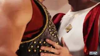 Caesar (MrDeepVoice) has crossed the Rubicon, but the Roman senate are against him claiming the title of emperor. At a private dinner, his allies give him advice on how to get the people on his side… and joke about his sexual exploits with his handsome gladiator champion (Dom King) when the ruler is out of earshot. Caesar challenges his rival senators Brutus and Cassius to settle their dispute at a gladiatorial game, his champion against theirs. Caesar is sure victory will soon be his, and it makes him horny, taking his champion to his bedchamber to sport together! Caesar is the scabbard to his champion’s sword, fellating his gladius and getting fucked on the bed. Caesar sits on the champion’s cock like it’s a throne, then moans his pleasure as he’s taken on his back till he shoots his imperial load!