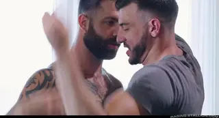 Ian Holms s'ennuie terriblement et n'a rien à faire, mais heureusement, il a un plan cul fiable qui est prêt à venir à l'improviste. Cinq pas après avoir franchi la porte, Jake Nicola est déjà avalé par Ian. L'hôte en rut saute ensuite sur son lit et expose son trou pour que le barbu le lèche. Son cul est maintenant prêt pour le forage bareback d'une vie, Ian glisse sur le poteau trop épais de Jake jusqu'à ce que son cul ait avalé jusqu'au dernier centimètre de la viande girthy du booty call. Le bruit des peaux qui s'entrechoquent s'amplifie au fur et à mesure que le top poilu s'enfonce de plus en plus fort dans Ian. Lorsque les deux sont prêts à exploser, Jake sous-estime la puissance de sa propre bite et son sperme vole rapidement à travers la pièce tandis qu'un Ian allongé recouvre ses poils d'une épaisse couche de sa propre couille.
