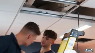 Stuck In the Ceiling: Michael Vente is new on the job site, and the more he watches experienced hunk Malik Delgaty at work, the more he wants a fuck break. When Malik goes up a ladder and his hard dick slips out his coveralls, Michael finally gets his chance to suck it, and then the top bends him over the ladder to fuck him! Michael rides the big dick and gets pounded in piledriver, then fucked hard on the floor. The bottom cums as Malik drills him in doggystyle and the top cums on his eager face.