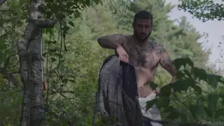 While out hiking alone on the trails, Jeremy London runs into tatted stud Derek Thibeau undressing at his campsite. He decides to sit back in the brush and watch as Derek strips completely naked and takes shower. Jeremy starts stroking his bulge thru his shorts at the site of Derek’s soaking wet body, glistening under the water and sun. After Derek towels off, Jeremy accidentally breaks a stick and gets noticed. Since he’s already here, Derek invites him into the campsite to give his uncut cock a sopping wet hummer. The thick cock grows rapidly in Jeremy’s mouth and he struggles to get his mouth down to the base. Derek wants more and bends Jeremy over a tree to introduce his raw cock into his tight hole. Jeremy reaches back and spreads his ass so Derek can have full bareback access. They move the fucking inside the tent where Jeremy impales his hole on Derek’s fuck stick. Switching positions one last time, Jeremy ends up on his back letting Derek have total control of his ass. Derek keeps pumping while Jeremy jerks out a load that hits his abs. Jeremy is still hungry for cum, so Derek takes him out of the tent and covers the bearded studs face in a thick load.
